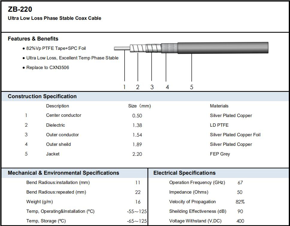 ZB220 cable for phased array radar, electronic countermeasures, and missile-borne applications (one of the phase-stabilized series);