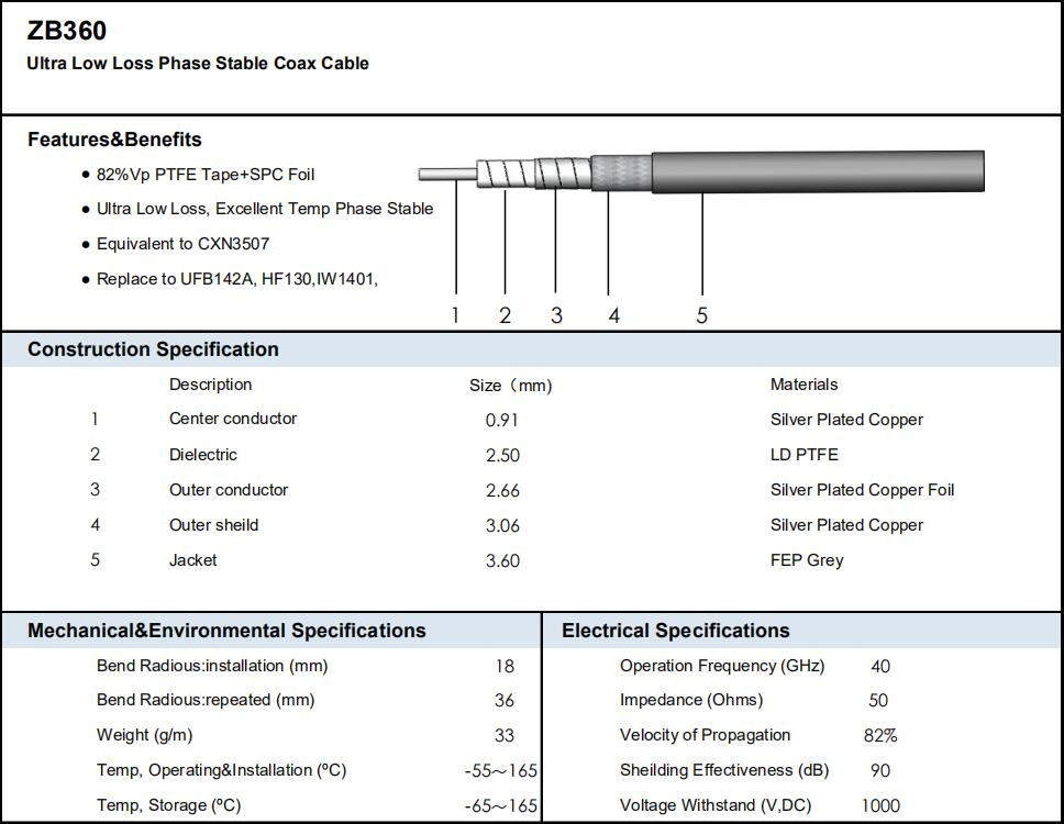 ZB360 cable can be used (one of the test grade series) for 5G communications, laboratories (such as electromagnetic compatibility laboratories), experimental equipment (network analyzers), etc.ZB360 cable is a test-grade cable, and its high quality mechanical phase stability (stable performance during bending) has won the application opportunities in these occasions. The maximum frequency range is up to 40GHz.